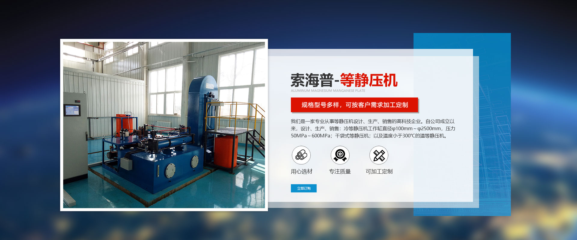四川索海普注冊于四川省成都市武侯區,是一家專業從事等靜壓機設計、生產、銷售的高科技企業。自公司成立以來,設計、生產、銷售:冷等靜壓機工作缸直徑φ100mm~φ2500mm,壓力50MPa~600MPa;干袋式等靜壓機;以及溫度小于300℃的溫等靜壓機。